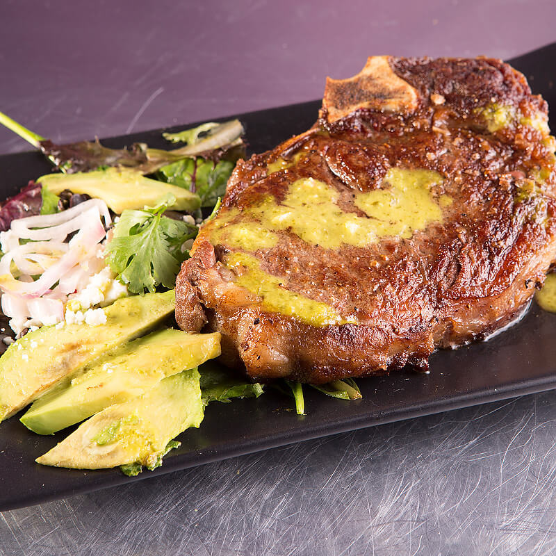 - Carve the steak into 1/2 inch thick slices. Mound the salad onto 4 serving plates. Fan the steak slices around the salad. Top with crumbled Cotija cheese.